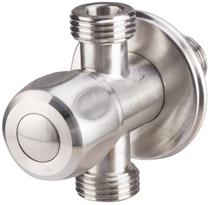 Stainless-steel angle valve with ceramic headwork by EvoSanitary®, a premium valve for water or non-aggressive fluids, with two outlets.